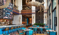 A tribute to La Mar’s deep connection to the sea is woven throughout the interiors. Subtle references to the ocean appear in layered shades of blue, handpicked tiles inspired by nautical patterns, and flowing chain curtains that evoke the movement of waves. Sculptural steel artwork by Pool Guillen, depicting native fish and traditional fishing boats, punctuates the walls, layered with rose gold screens designed on fish scale shapes, provide a modern edge.